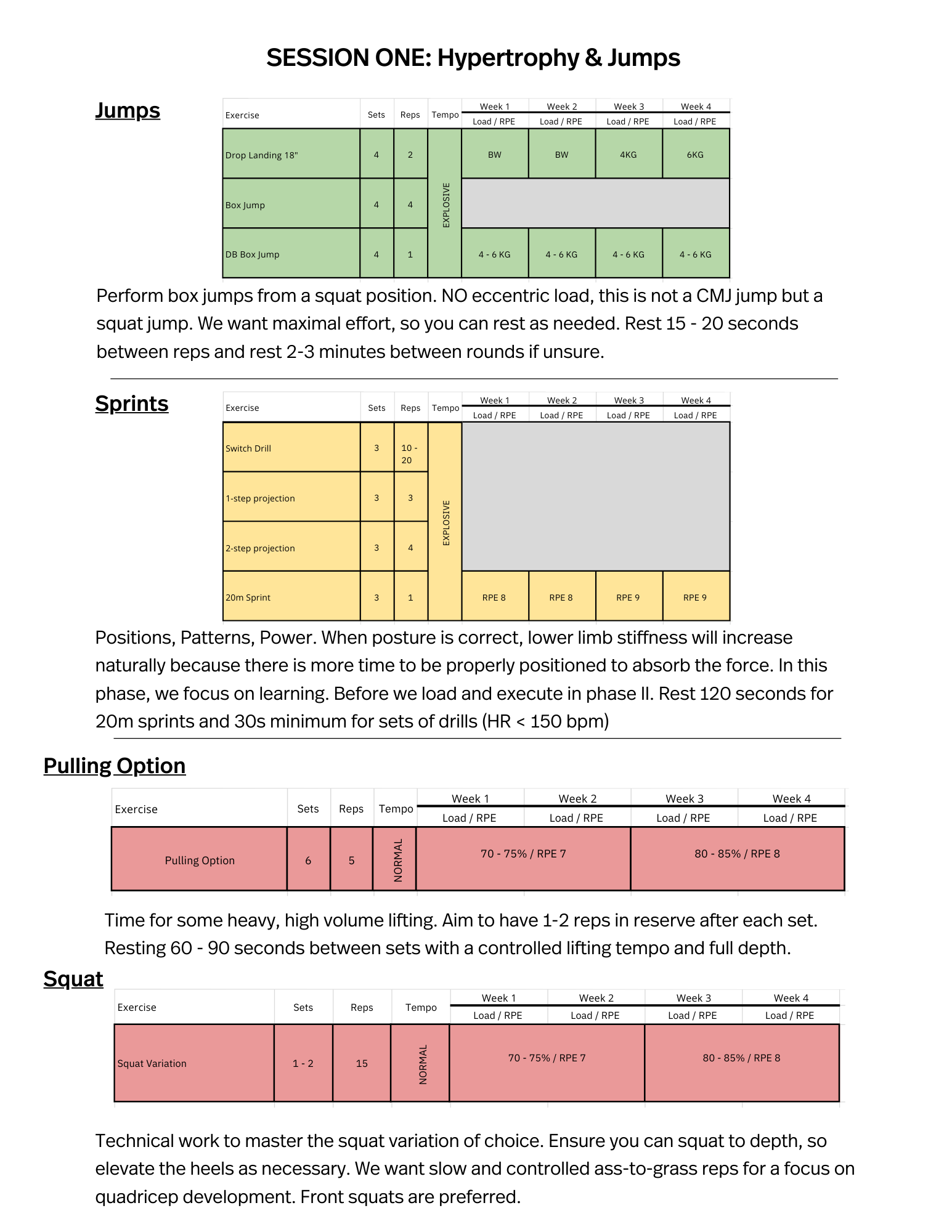 You will want access to a general weight room, resistance bands and/or a barbell / dumbbell at home. Sleds and medicine balls are awesome for loading jumps and throws (optional but not required as adaptations can be made).